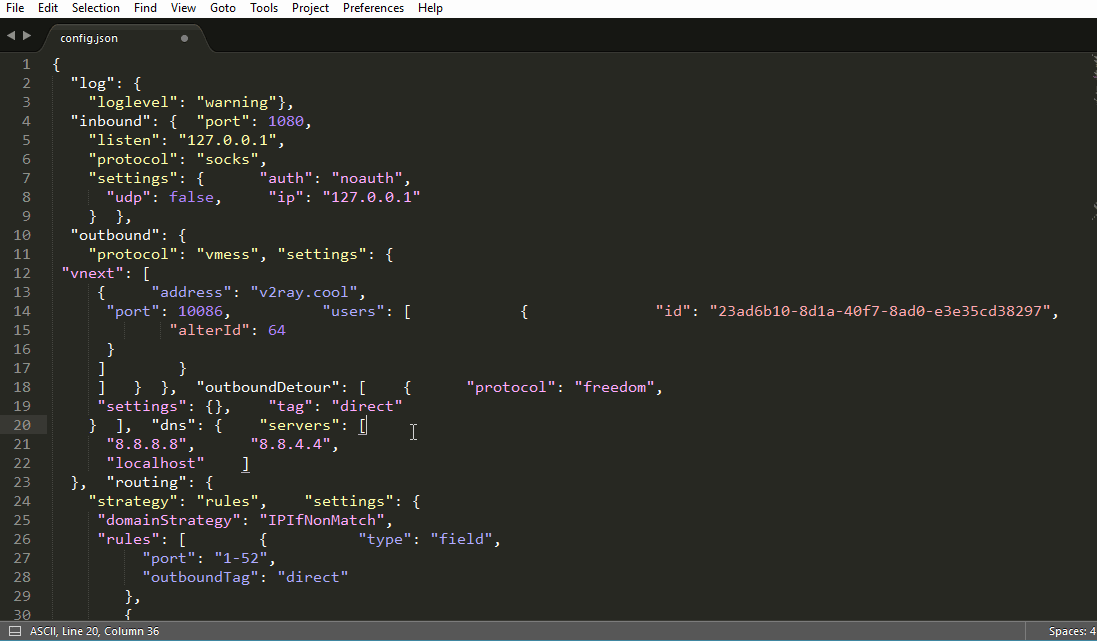 不过,最好还是使用 V2Ray 提供的配置检查功能(test 选项),因为可以检查 JSON 语法错误外的问题,比如说突然间手抖把 vmess 写成了 vmss,一下子就检查出来了。