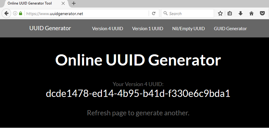 - 由于 id 使用的是 UUID 的格式,我们可以使用任何 UUID 生成工具生成 UUID 作为这里的 id。比如 UUID Generator (opens new window) 这个网站,只要一打开或者刷新这个网页就可以得到一个 UUID,如下图。或者可以在 Linux 使用命令